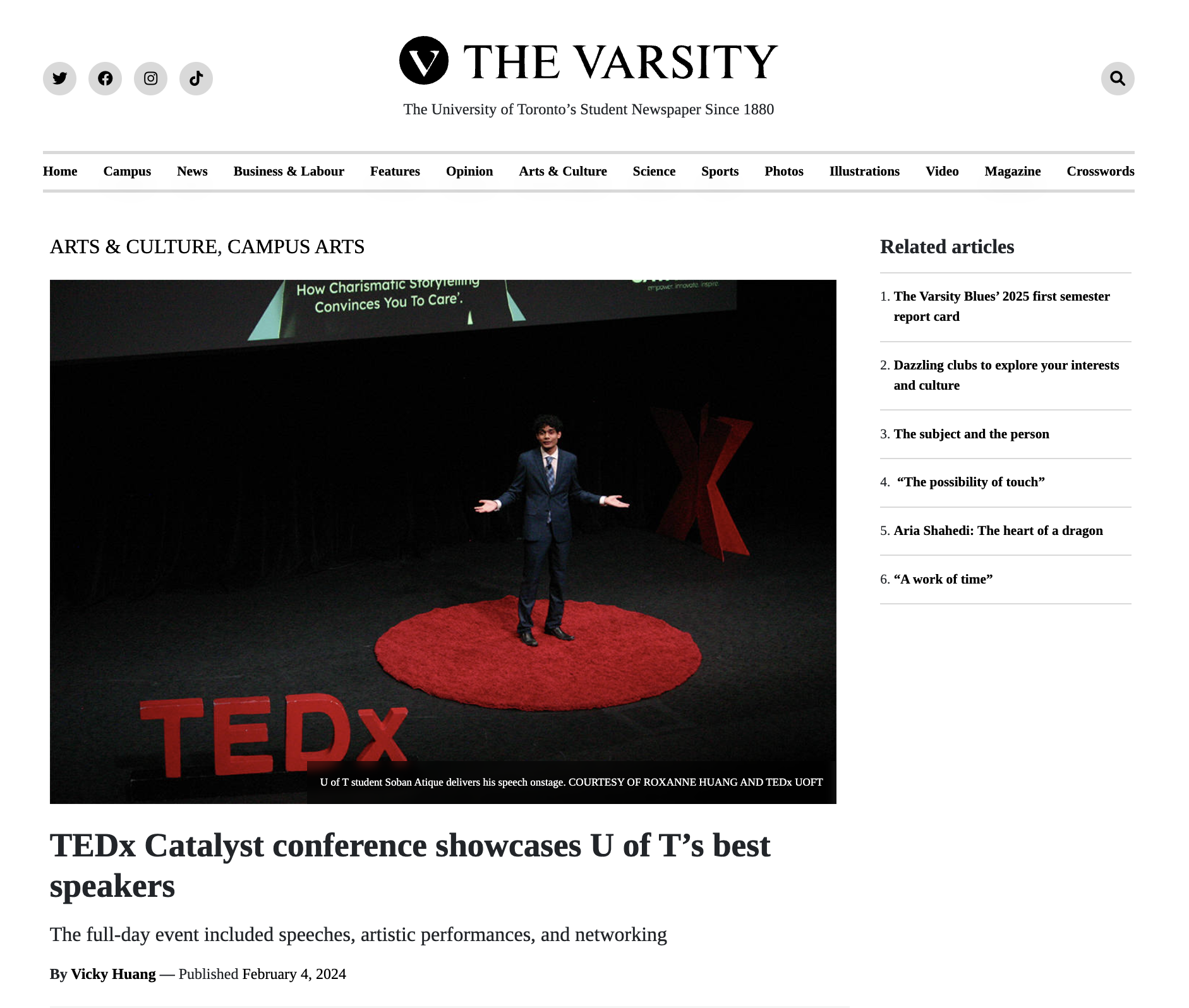 Feature coverage of TEDxUofT’s Catalyst Conference by Vicky Huang in The Varsity (February, 2024).